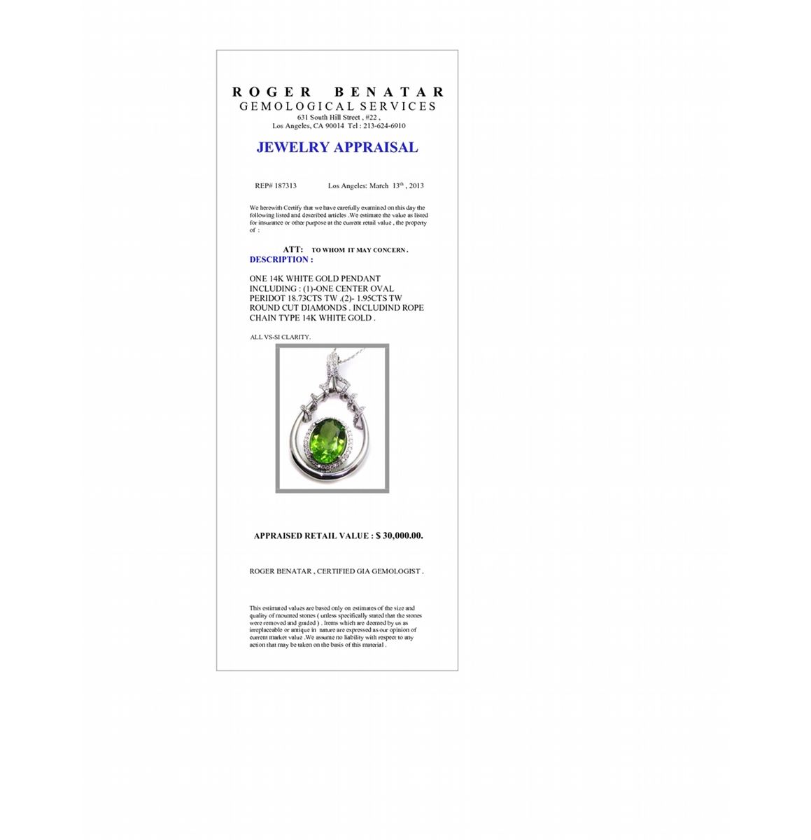 PERIDOT 18.73CT, 14K W/G NECKLACE _______ DIAMOND 1.95CT