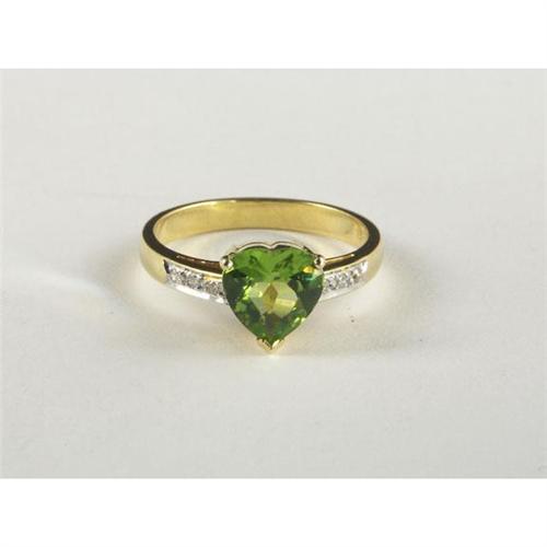 RING: Charming 14k yellow gold lady's ring set with a heart shaped peridot and diamonds. The olive green peridot measures approximately 1.50 cts and is transparent. The diamonds measure approximately 0.04 ctw, have SI3 to I1 clarity and H to I color. Appraisal included.