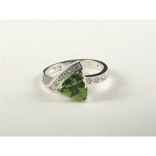 RING: Modern 14k white gold lady's ring set with a trillion cut peridot and round cut diamond. The light olive green peridot measures approximately 1.50 cts and is transparent. The diamonds measure approximately 0.06 ctw, have SI1 to I1 clarity and I color. Appraisal included.