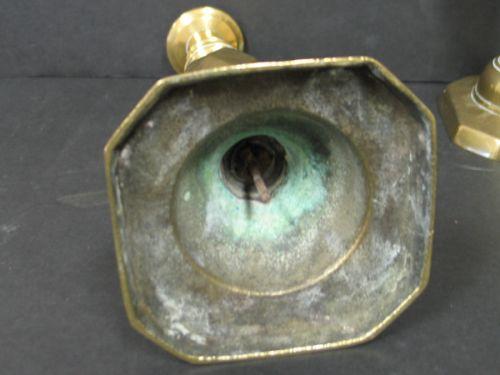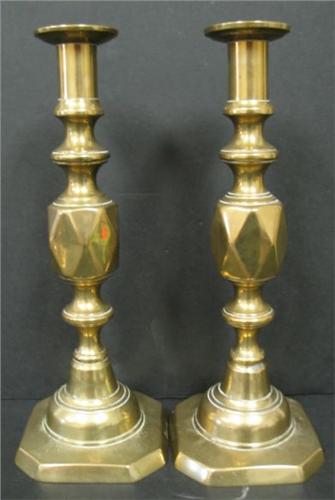 PAIR OF PERIOD BRASS PUSH-UP CANDLESTICKS. Queen of Diamonds pattern. Marked on base. 11.5” H