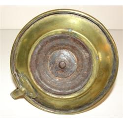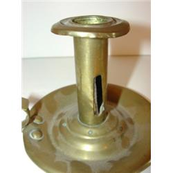PERIOD BRASS PUSH UP CANDLESTICK. Missing push-up knob. Brass shows signs of wear and pitting. Handled. 3.5" H