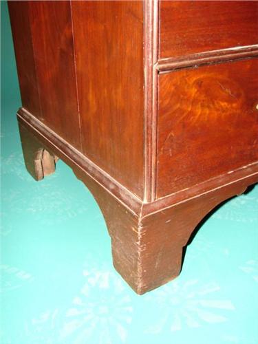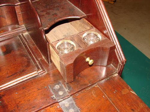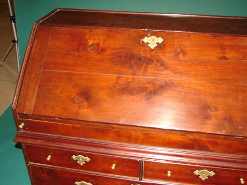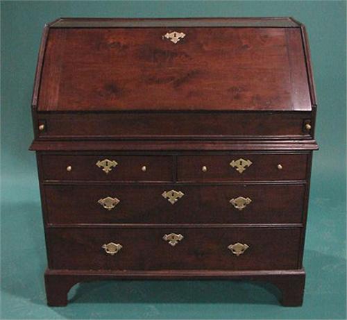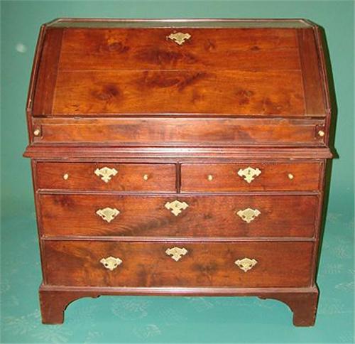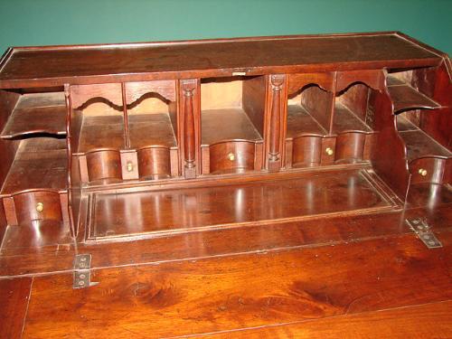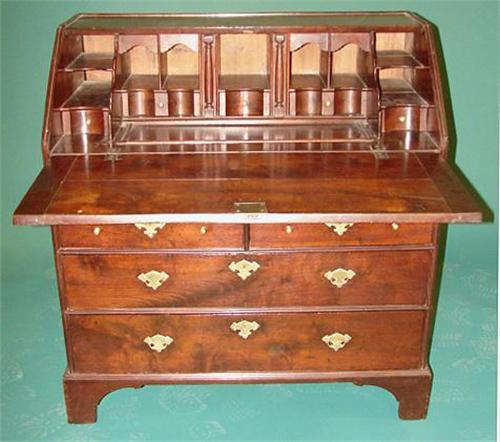 PERIOD DELAWARE VALLEY DESK. Rare walnut Queen Anne slant front desk with flush drawers, bracket feet, and mid-molding map drawer. Step-up interior with shaped drawers and two original glass ink bottles and well. Bottom of one drawer is signed “James Brown”. Delaware Valley region circa 1740. With original bill of sale from Chalfant Antiques on December 27, 2004. From the Estate of Alice B. Biggs. 41”H, 38”W, 20”D