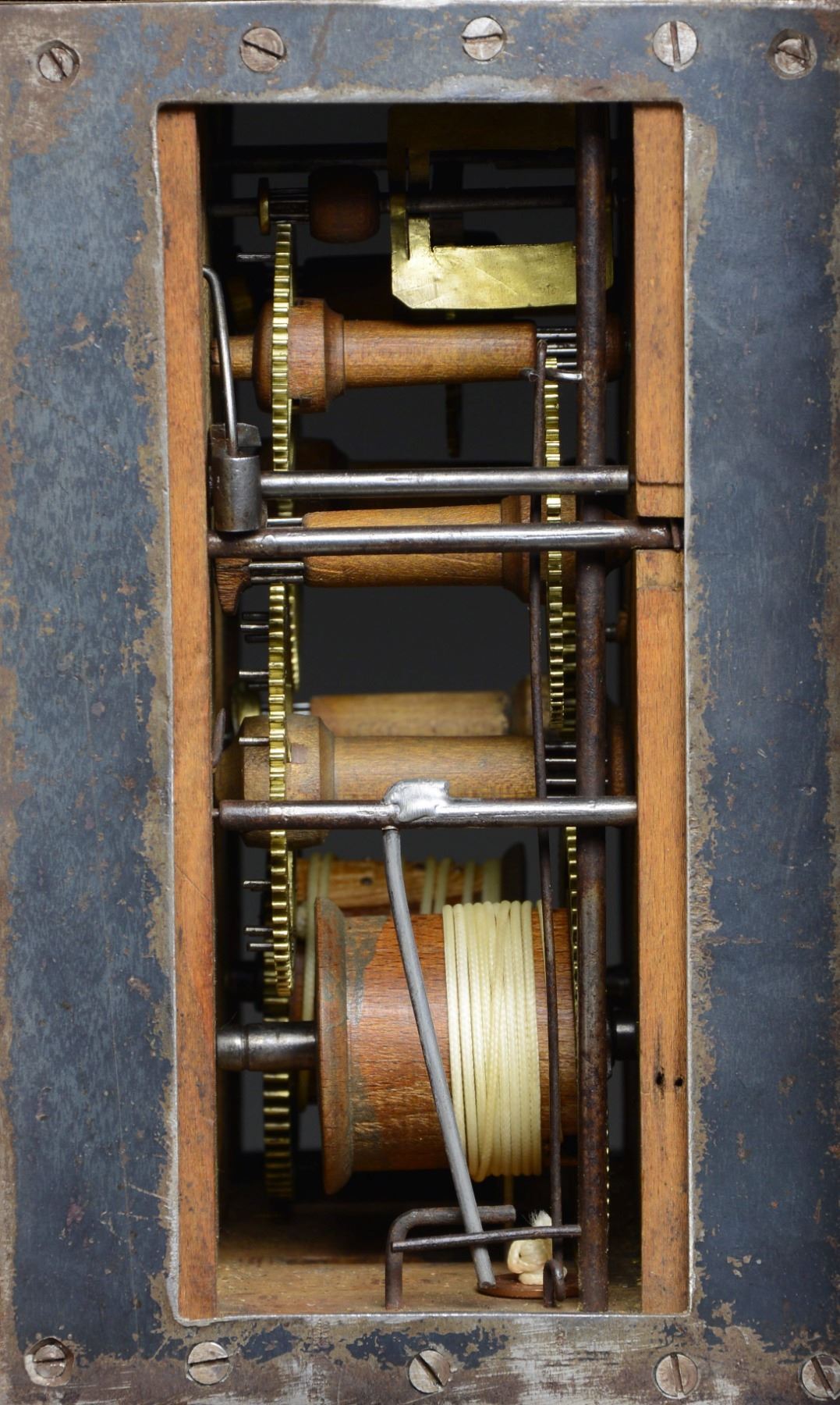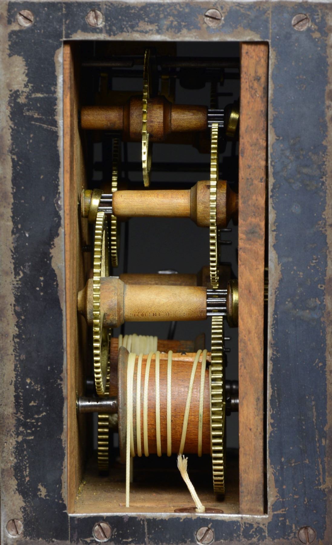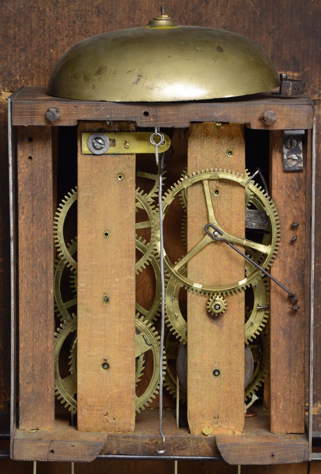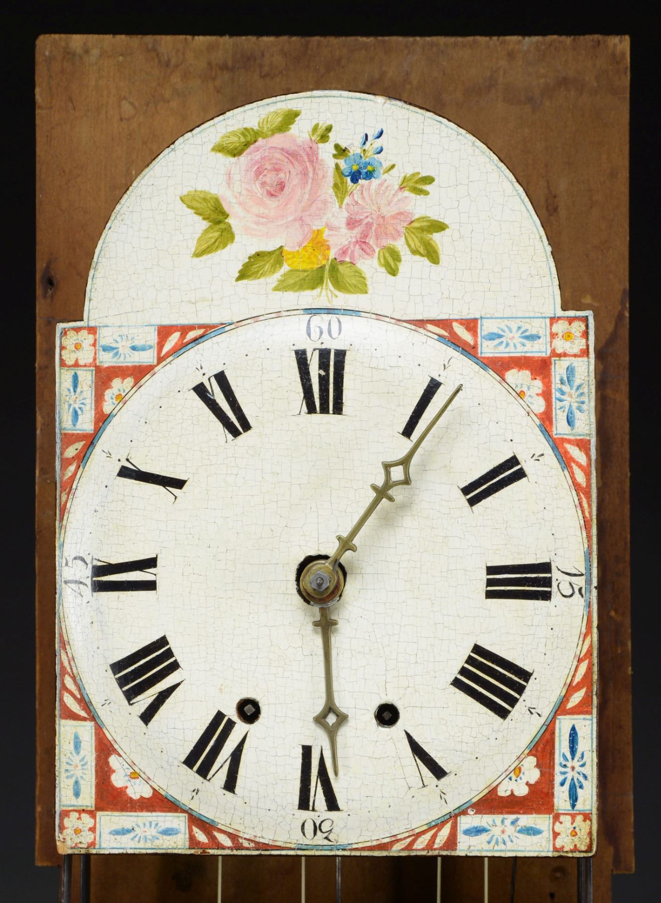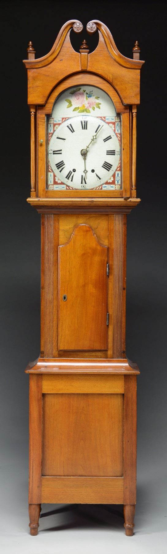 Early 19th century Berks County, Pennsylvania. The tall walnut clock with dovetailed bonnet and swan's neck pediment with reeded finials and arched glass door flanked by colonettes. The narrow throat with "tombstone" door above the molded waist on a box base with inset panel raised on ring, turned short legs. The painted wood dish dial, floral decorated in the arch, and with cinnabar painted floral spandrels in the Pennsylvania Dutch taste. The dial with Roman numeral chapter ring. The brass movement with time and strike, weight driven mechanism striking on a bell. Possibly a Black Forest German movement. Clock is offered with pendulum, bob, two weights, winder, and door key. SIZE: 66" h x 11" throat x 9" d. CONDITION: case professionally cleaned and repolished. Movement restored and cleaned in 1961 by "M.G. Reist, REIST, the 'clock man', West Lawn, Pennsylvania. PROVENANCE: Pennsylvania Estate Collection. (05-833/TG). $1,000-1,500.