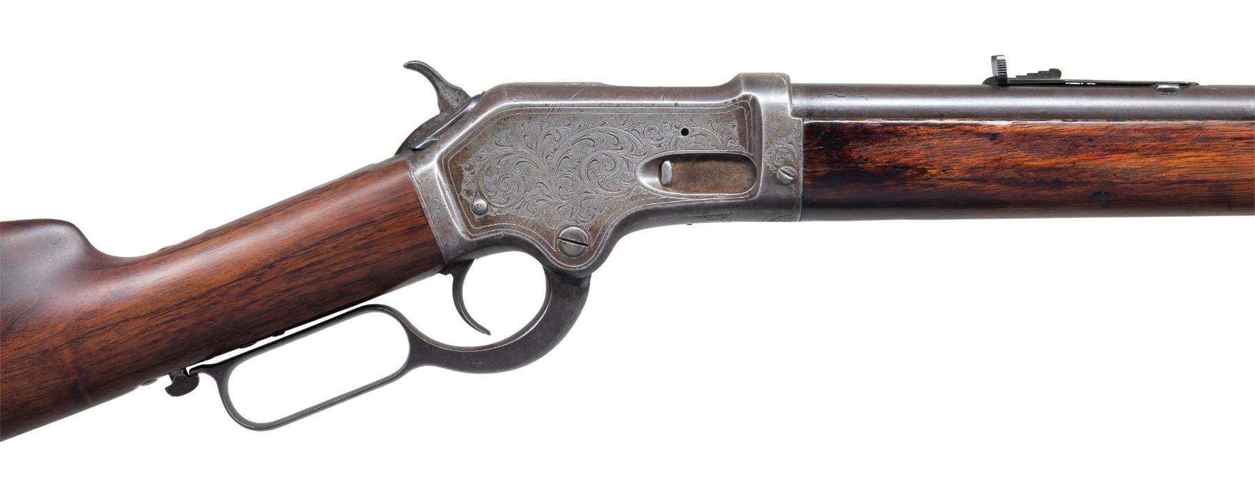 Cal. 44-40. S# 1913. Bbl. 25 1/2" rnd. with Hartford address. German silver blade Rocky Mountain front sight with elevator adj. semi-buckhorn sporting rear sight. Full length tubular mag. Action has generous coverage of vine type foliate scroll hand engraving with punch dot backgrounds of the L.D. Nimschke style that continues to the buttplate peak. Original walnut forearm. Replacement walnut stock utilizing original crescent steel trapdoor buttplate. Total of 6,403 mfg. 1883-1885. UNATTACHED ACCESSORIES: original stock is broken from top tang through toeline area with a epoxy repair. Comb of stock is trimmed to a low position. Prior unknown auction listing. CONDITION: metal has faded to a smooth gray patina showing scattered dents and spots of light pitting. Refinished forearm has repairs along the bbl. channel with remaining dents and marks. Replacement stock shows small dents and scratches. Sound mechanics. Pitted bore retains largely intact rifling. PROVENANCE: The Esteemed Norm Greenberg Collection. (01-27708/DS). ANTIQUE. $5,000-9,000.