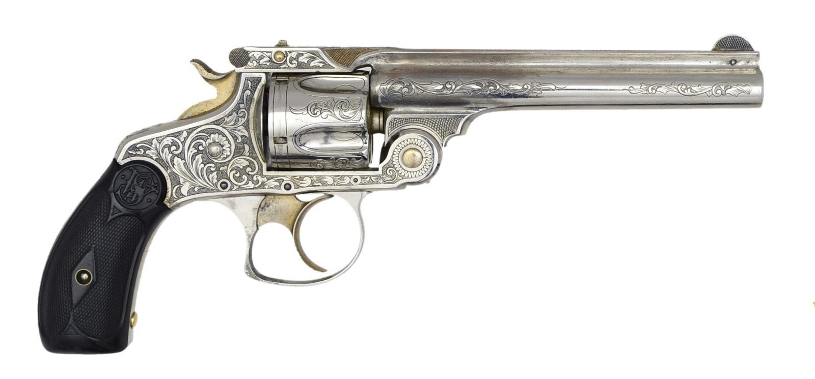 REVOLVER. Cal. 38 S&W. S# 283931. Bbl. 5" rnd. w/ rib & semicircular sight. 5 Shot fluted cyl. Top break action. Frame including back strap & trigger guard, cyl., & bbl. including front sight having 75% coverage of finely executed hand engraving. Engraving consist of vine type foliate scroll w/ cross hatch highlights & punch dot backgrounds. Full nickel finish w/ gold finished hammer, trigger, top latch & action screws. 2 Piece checkered hard rubber grips. Butt of gun is marked 2 stars indicating factory rework. Mfg. 1884-1895. CONDITION: bbl., action & cyl. retain over 95% nickel finish showing spots of flaking & freckling. Gold finished parts have worn & thinning finish. Grips show moderate wear w/ sm. cracks at bottom of right panel. Sound mechanics. Lightly pitted bore w/ intact rifling. (01-18687/DS). ANTIQUE. $900-1,500.