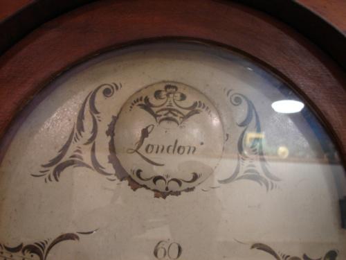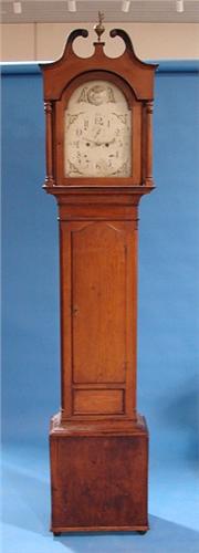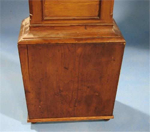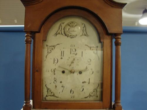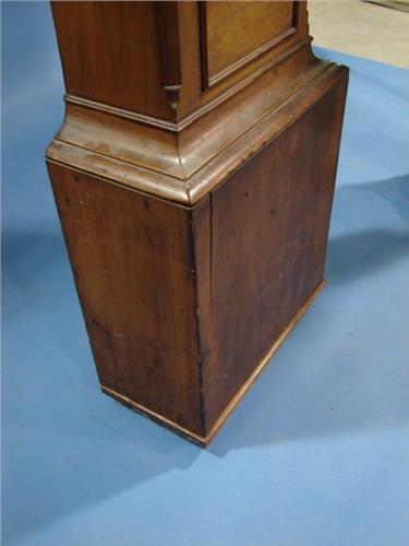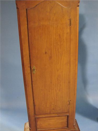 PERIOD PINE TALL CASE CLOCK. Dovetailed bonnet. Lamb’s tongue corners. Broken arch top with eagle finial. Ball feet. Clock face is marked “London”. Has weights and pendulum. Shows cracking to wood at bottom. 95” H, 18.5” W, 9.5” D
