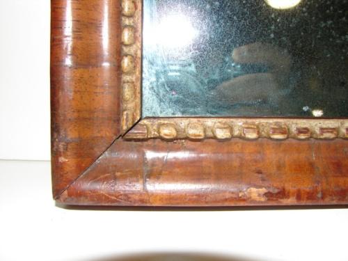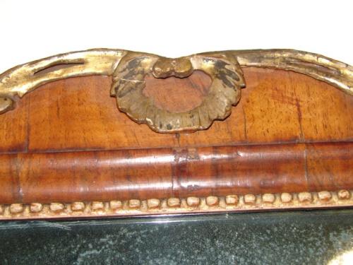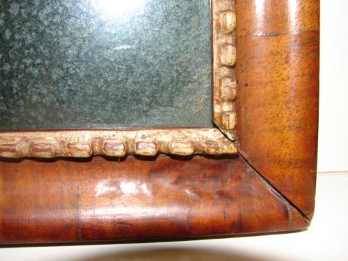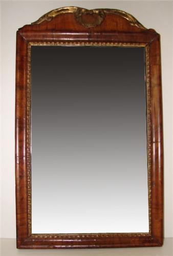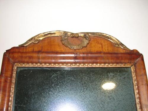 PERIOD QUEEN ANNE WALNUT & GILT COURTING MIRROR. Original mirror. Shingle back. Mirror needs to be resilvered. Shows some loss to gilt at top. 13” x 21.75”