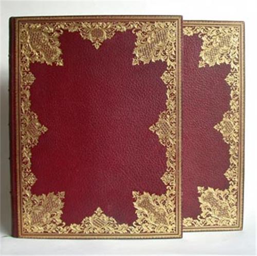 PERRAULT, Charles.- Cendrillon. Les Fées [- La Barbe bleue. La Belle au bois dormant]. [ Paris, Boussod, Valadon et Cie], (Asnières-sur-Seine, 1886 [- 1887]). 2 vol. in-f° (qqs pet. traces d'aquarelles à 1 p., pet. déchirure marginale restaurée à un feuillet). Reliure "à la dentelle" pastiche d'édition : plein maroquin grenat, plats sertis d'une large dentelle dorée, dos à nerfs fleuronnés dorés, doublures et gardes volantes de soie blanc éburnéen, tête dorée, entièrement monté sur onglets (qqs taches foncées sur les plats, plats lég. frottés). Sous étuis (lég. abîmés).