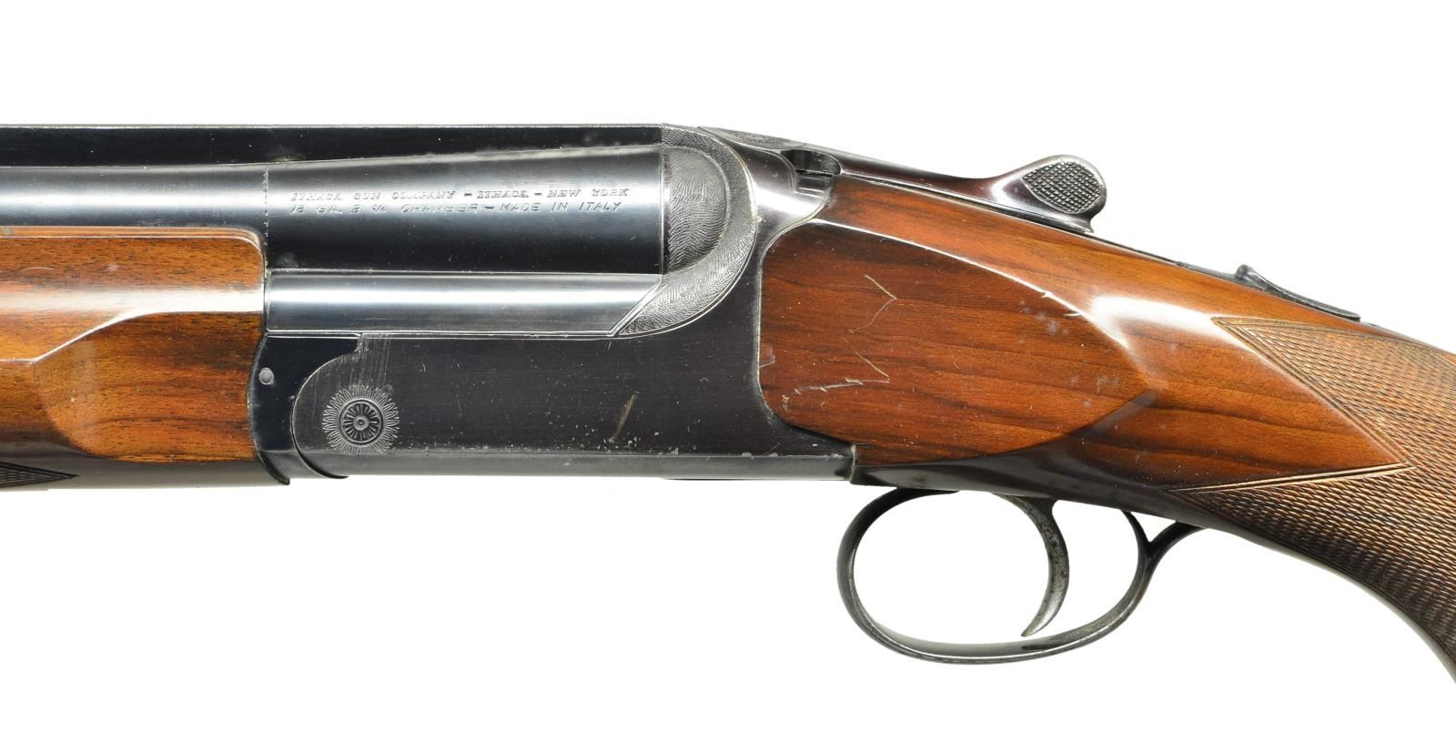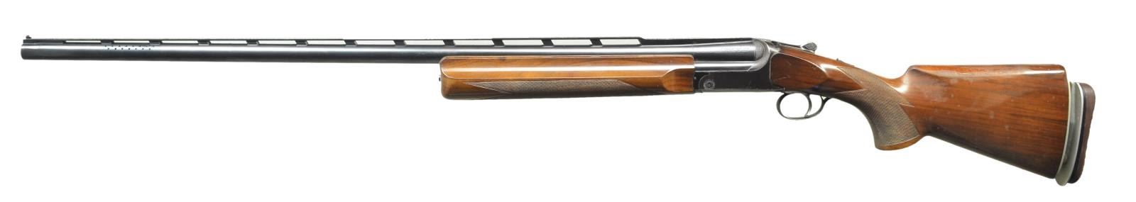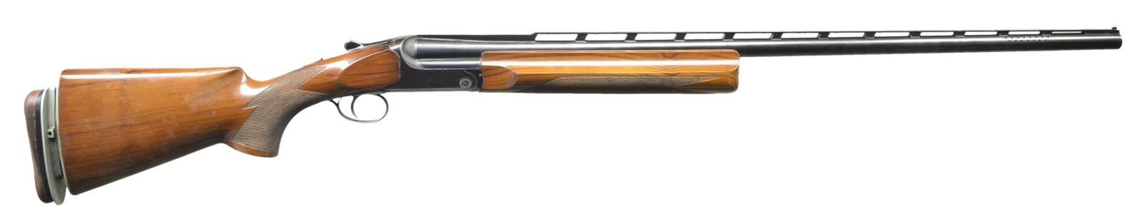 ITHACA. Cal. 12 Ga., 2 3/4". S# 1721. Bbl. 32" ported, monobloc w/ raised ventilated rib has Perazzi & Ithaca information on either side of monobloc. Bbl. flats are stamped w/ Italian nitro proofs for 2 3/4" chambers. Blued low profile action has removable trigger group w/ V-spring. Action has some line border engraving & matting on fence. Pistol grip buttstock of lightly veined European walnut measures 13 3/4" over adj. trap pad. Point pattern checkering is at grip. Matching long beavertail forend has Anson type release. Single bbl. MEASUREMENTS: BBLS: Bore Diameter: .729". Restriction: .038". WEIGHT: 8 lb. 11 oz. CONDITION: good to very good, metal parts showing considerable hand wear retaining about 80% original finish. Stocks also have a few minor marks in their original varnish, checkering is lightly worn. Bore is bright & shiny. Mechanically good. (22-2132/MGM). MODERN. $1,200-1,600.