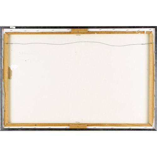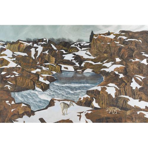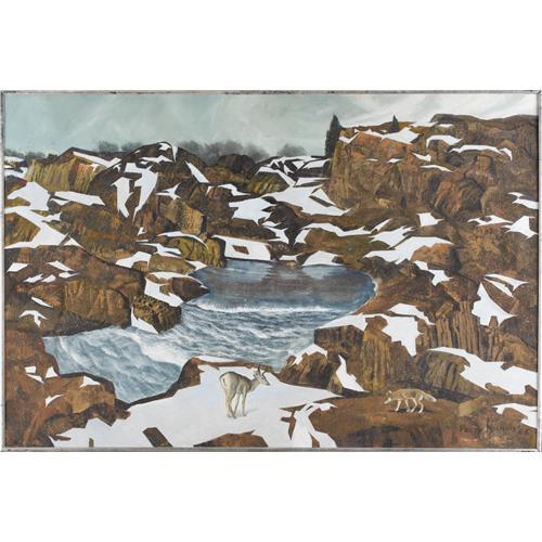 <B>PERRY NICHOLS (1911-1992)</B></I><BR><I>Stalking,</B></I> 1988<BR>Oil on canvas<BR>24in. x 36in.<BR>Signed and dated lower right<BR>Titled verso<BR><BR>An important late painting of Perry Nichols, whose later works are characterized by a surrealist tone. In this impossible landscape the rushing water flows to nowhere. What at first glance appears to be snow on the carefully rendered rock forms are really just geometric shapes juxtaposed on the rock.<BR><BR>Provenance:<BR>Estate of Perry Nichols<BR><BR> <B>Condition Report:</B> Excellent condition with original canvas. No restorations. Original frame in excellent condition.<BR><BR><b>Shipping:</b> Requires 3rd Party Shipping (<a target="_blank" href="http://www.heritageauctions.com/common/shipping.php">view shipping information</a>)