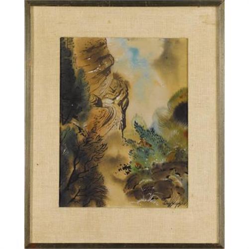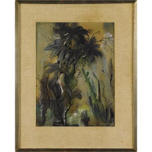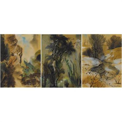 <B>PERRY NICHOLS (1911-1992)</B></I><BR><I>Three Seasons Triptych</B></I><BR>Gouache, watercolor, and ink on paper<BR>14-1/2 x 11 inches (36.8 x 27.9 cm)<BR>Signed lower right (on each)<BR><BR> Three watercolors depicting different seasons: winter, spring, and summer. The watercolors have a Japanese influence and calligraphic line.<BR><BR>Provenance:<BR>Estate of Perry Nichols<B>Condition Report:</B> Excellent condition. Period frame in good condition.<BR><BR><b>Shipping:</b> Requires 3rd Party Shipping (<a target="_blank" href="http://www.heritageauctions.com/common/shipping.php">view shipping information</a>)
