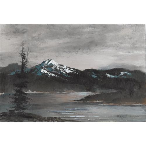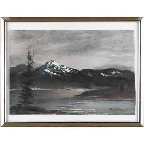 <B>PERRY NICHOLS (1911-1992)</B></I><BR><I>Night Memory,</B></I> 1990<BR>Gouache and oil on board<BR>15in. x 22in.<BR>Signed lower right<BR><BR>The unique combination of media and variety of paint applications, create a dreamlike sense of depth and atmosphere. It is an example of the artist's series of visionary landscapes.<BR><BR>Provenance:<BR>Estate of Perry Nichols<BR><BR> <B>Condition Report:</B> Excellent original condition. New frame in excellent condition.<BR><BR><b>Shipping:</b> Requires 3rd Party Shipping (<a target="_blank" href="http://www.heritageauctions.com/common/shipping.php">view shipping information</a>)