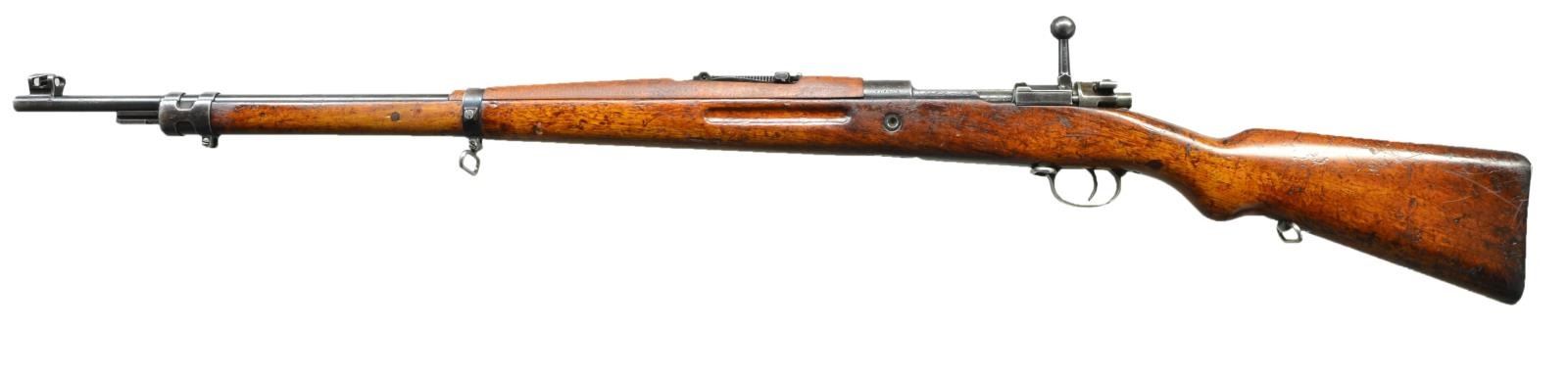 Cal. 8mm. S #2142 (Translated from Farsi). Bbl. 29" w/ import marking. Farsi number on stock matches receiver but bolt does not. Top of receiver has Persian lion crest. Right of receiver has four small Persian acceptance stamps. Left of receiver has Farsi S # & Farsi writing on side rail. Tangent rear sight. Inverted V front sight with protectors. No cleaning rod present. Importer paper tag present on triggerguard. Bottom mounted sling swivels. Hardwood stock. CONDITION: stock set has an armory added oil finish w/ scattered flaking most notably on handguard which is mostly devoid of oil finish, some scarring ahead of rear band from improper removal, dings, dents & handling marks. Metal is thinning to gray w/ some light pitting spots, scattered traces of original blue and oxidation staining. Poor bore showing scattered pitting & frosting w/ worn rifling. (22-2544/MJC). CURIO. $400-600