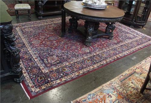 CARPET: Persian Mashad carpet of hand knotted wool woven on a cotton warp measuring approximately 12'8'' x 9'7'', medallion pattern, red field and navy border.