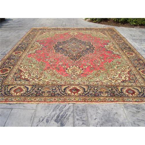 THIS GORGEOUS ANTIQUE PERSIAN TABRIZ RUG IS BEING OFFERED FOR SALE. HAND WOVEN IN THE 1940'S IN THE CITY OF TABRIZ IN IRAN, THIS 100% WOOL RUG MEASURES 9'9" X 13'. THE DESIGN OF THE RUG IS KNOWN AS AFSHAN SHAHABBASI WITH ABUSSAN PATTERN WHICH IS A CLASSIC DESIGN OF ORIGINAL TABRIZ. THE RUG IS OF VERY FINE QUALITY AND IN VERY GOOD CONDITION FOR THE AGE WITH MINIMAL WEAR. THE RUG WAS PHOTOGRAPHED OUTDOORS SO THE TRUE COLORS ARE REPRESENTED. PERSIAN RUGS ARE EXTREMELY DURABLE AND UNLIKE CARPET, SPILLS BEAD UP AND DO NOT ABSORB READILY DUE TO THE MANY KNOTS PER SQUARE INCH OF THE RUG WHICH MAKES IT VERY DENSE. SOAP AND WATER CAN BE USED ON THE PERSIAN RUGS WITHOUT ANY BLEEDING. THIS RATHER MUTED RUG IS ONE OF MY FAVORITES WITH THE MINT GREEN AND REDS. UPS CAN SHIP WITHIN A FEW DAYS AND AT A REASONABLE PRICE. SHOULD YOU WANT A SHIPPING QUOTE, PLEASE EMAIL ME YOUR ZIP CODE. THANK YOU FOR VIEWING!