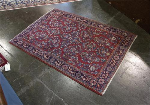 CARPET: Persian Sarouk carpet of hand knotted wool woven on a cotton warp measuring approximately 4.11 x 3.3, allover pattern, red field and navy border.