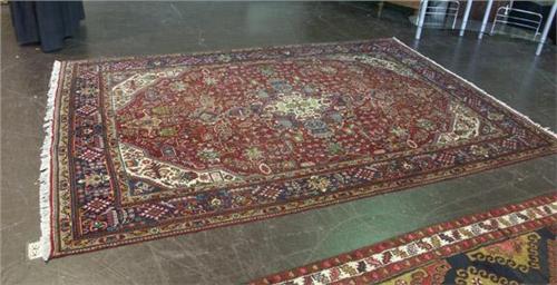CARPET: Persian Tabriz carpet of hand knotted wool woven on a cotton warp measuring approximately 10.0 x 6.1, medallion pattern, red field and blue border.
