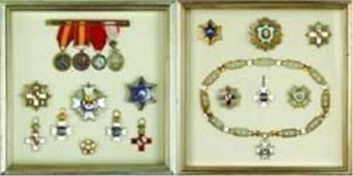 ITALY: Order of the Crown, Commander's Cross (neck bagde, gold ?, without ribbon). Highly attractive group of a high-ranking Spanish officer of military justice from 1st half of 20th century! All orders and decorations are mounted for display in two glased frames, which were not opened; the badges are glued to textile background and were not exactly examined!