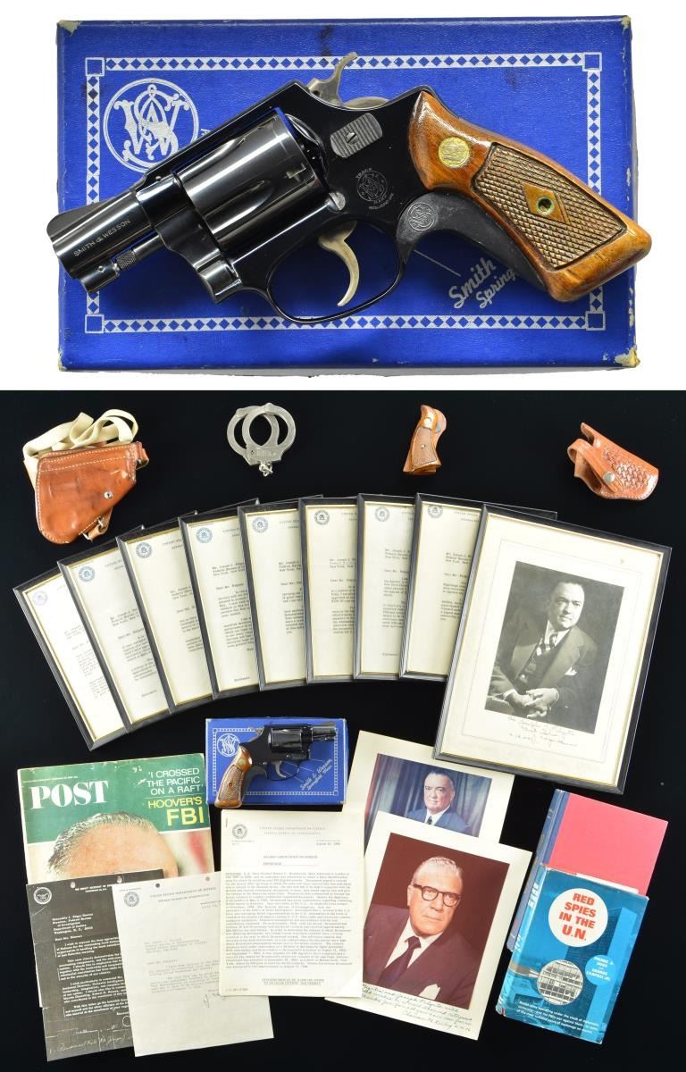 REVOLVER W/ BOX OF LAUDED FBI SPECIAL AGENT JOSEPH PALGUTA. Cal. 38 Spl. S# 156820. Bbl. 1 7/8” pinned w/ serrated ramped blade; frame notched rear. Mfg. Approx. 1959 w/ early serrated flat cyl. release latch. Black alloy frame w/ blued bbl. (matching numbered) & cyl. (matching numbered extractor). Square butt J frame w/ matching numbered diamond center checkered walnut Magna grips having silver medallions plus black plastic S&W grip adaptor. Standard grooved faced trigger & checkered hammer; both case colored. Special Agent Palguta, under former FBI Director J. Edgar Hoover, was instrumental in capturing US-Russian Spy Nelson Cornelius Drummond who was the 1st black American tried double agent of the Cold War era. Pagulta also was commended for the services he provided in connection with the Soviet spy Julius Rosenberg espionage case. UNATTACHED ACCESSORIES: near excellent 2 piece blue box w/ reinforced corners & label indicating “38 Chiefs Special Airweight Square Butt” plus “Blued” & “2 Inch”. Within box is NOX-RUST WRAPPER plus uncompleted warranty card except for S# & dealer info; factory printed April 15, 1955. Original bill of sale from Charles Greenblatt Police Equipment of New York, NY dated May 26, 1959 to Special Agent Joseph J. Palguta - FBI further listing his height, weight & age of 45; $53.61 less 3% discount yielding $55.21. Very good Bianchi brown leather clamshell shoulder holster & Bianchi Colt Det. #5 belt loop holster w/ retaining strap plus basket weave design. EXTRA SPECIAL AGENT ITEMS: nickeled Model 90 S&W handcuffs mfg. 1952-1979 numbered 61818; no key. Framed Hoover (1st FBI Director; 1935-1972) inscribed & autographed 1958 photo to agent. Unframed Hoover inscribed & autographed 1971 photo to agent & wife. Unframed Clarence Kelly (2nd FBI Director; 1973-1978) inscribed & autographed 1976 photo to agent & wife. Framed Hoover signed acknowledgement of 10 years service dated 1958. 3 Hoover signed recognition statements from 1951, 1957 & 1960. 1964 Deputy Secretary of Defense (Cyrus Vance) letter of praise referring to Agent Palguta (and others) sent to Hoover. 4 Framed monetary award bonus letters signed by Hoover dated 1955, 1957, 1964 & 1966; $200, $200, $150 & $200 respectively. Hoover signed 1962 special service recognition letter in reference to Nelson Drummond case. Envelope containing a hand written note to “”Joe” with the FBI summarization of Drummond’s espionage dated 1964. Hardbound 1965 book w/ dust jacket titled “Red Spies in the UN” containing reference to Drummond. Hardbound 1979 book titled “The Bureau” by William Sullivan summarizing “My Thirty Years in Hoover’s FBI” referring to Drummond case pages 162 to 195. Sept 25, 1965 "Saturday Evening Post" magazine w/ extensive article about Hoover’s FBI & article about Bill Cosby due to popularity of his “I Spy” TV series costarring Robert Culp. CONDITION: very faint cyl. turn line, function wear on hammer, peppery oxidation on right side of trigger & light marks on grips; all other aspects including bore are near excellent. (22-6178/NW). CURIO. $3,000-5,000.