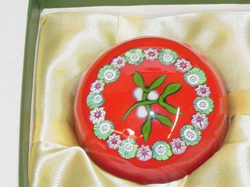 PERTHSHIRE PAPERWEIGHT-MISTLETOE ON RED GROUND W/ ALTNERNATING GREEN & WHITE CANES, DATED P 1972 W/ ORIGINAL BOX & CERTIFICATE (#161)