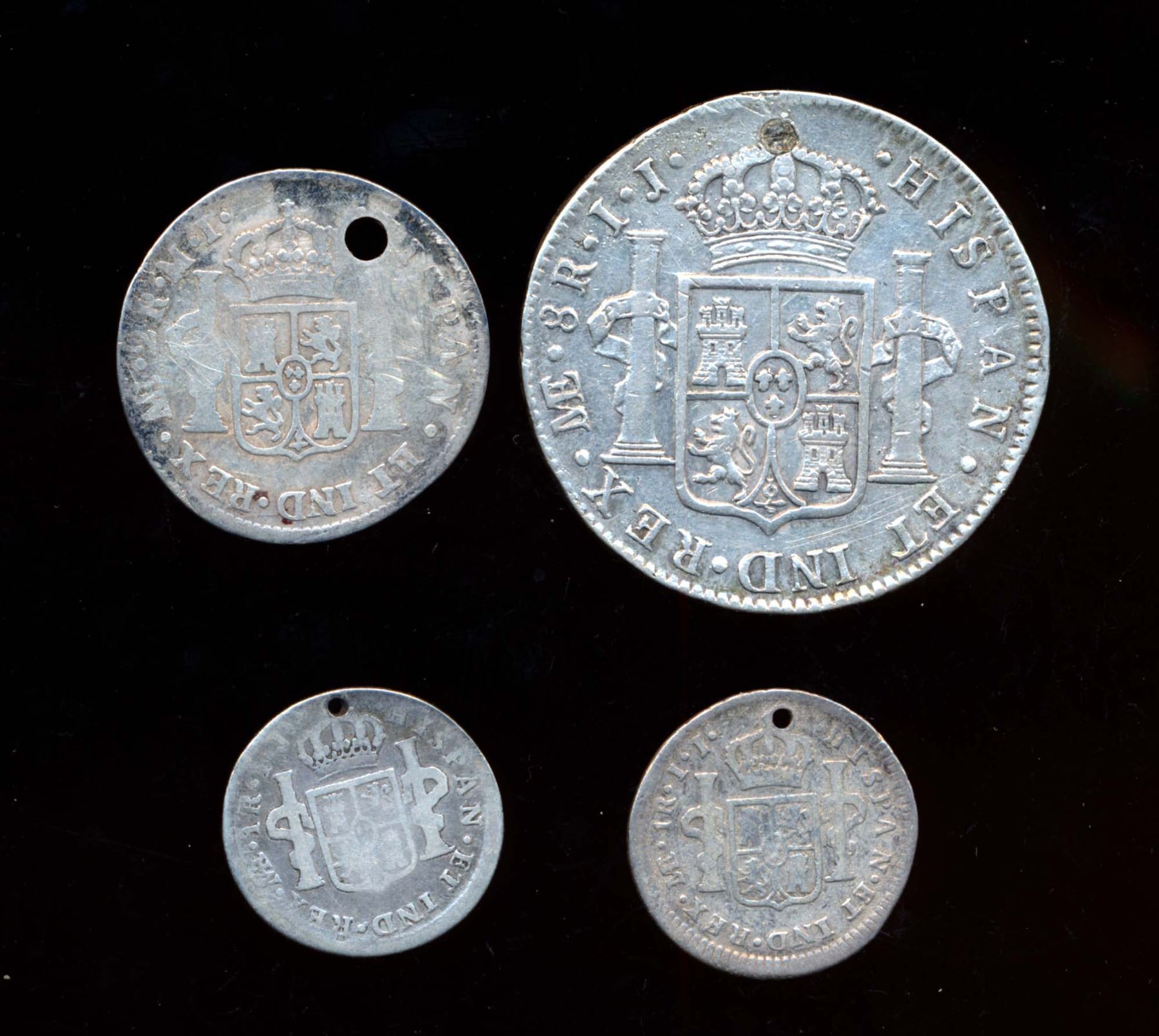 All have been holed but the 8 Reales KM# 96 was repaired and grades as a Very Fine+, the 1782 M.J. 2 Reales is a Fine and 2 x One Real are struck with completely different obverse dies.