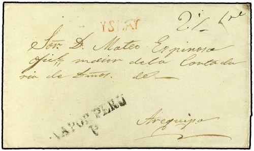 (1850 CA.) Envuelta dirigida a AREQUIPA. Marca YSLAY en rojo y VAPOR PERU/P en negro.