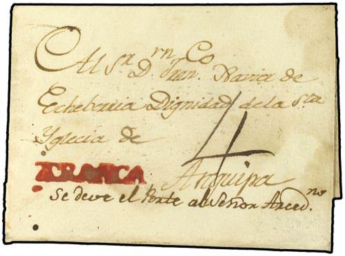 (1800 CA.) Envuelta dirigida a AREQUIPA. Marca TARAPACA en rojo. Manuscrito "Se deve el Porte al Sr. Arzo". MAGNIFICA.