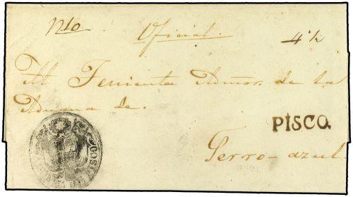 (1845 CA.). Envuelta dirigida a CERRO AZUL. Marca lineal PISCO en tinta de escribir y marca ovalada de la PREFECTURA DE PISCO.