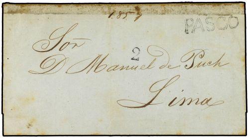 (1850 CA) Envuelta dirigida a LIMA. Marca PASCO en negro. Manchas de cinta adhesiva en la parte superior.