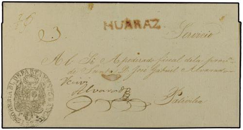 (1840 CA.) Envuelta dirigida a PATIVILCA. Marca HUARAZ en rojo y TESORERIA DEL DEPARTAMENTO DE ANCASH.