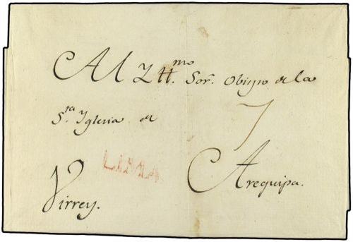 (1800 CA) Envuelta enviada del Virrey del Peru al Obispo de Arequipa. Marca lineal LIMA en rojo.