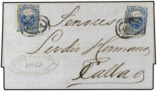 (1882 CA.) GUERRA DEL PACIFICO. ARICA a CALLAO. 5 cts. azul con sobrecarga en violeta YCA (Sc. 16 NI). MUY RARA.