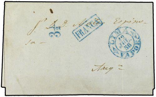 1856 (12-Jul.) LIMA a AREQUIPA. Fechador LIMA/VAPOR y FRANCA ambos en azul. MAGNIFICA Y RARA.