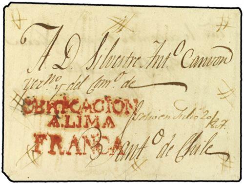 1807 (20-Julio) LIMA a SANTIAGO DE CHILE. Marca CERTIFICACION / A LIMA y FRANCA en rojo. MAGNIFICA Y RARA.