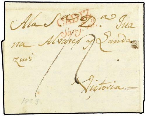 1823 (2-Enero) LIMA a VITORIA (España). Marca CADIZ/SAN FERNANDO en rojo estampada a la entrada en España, tasa de ´12´ reales.
