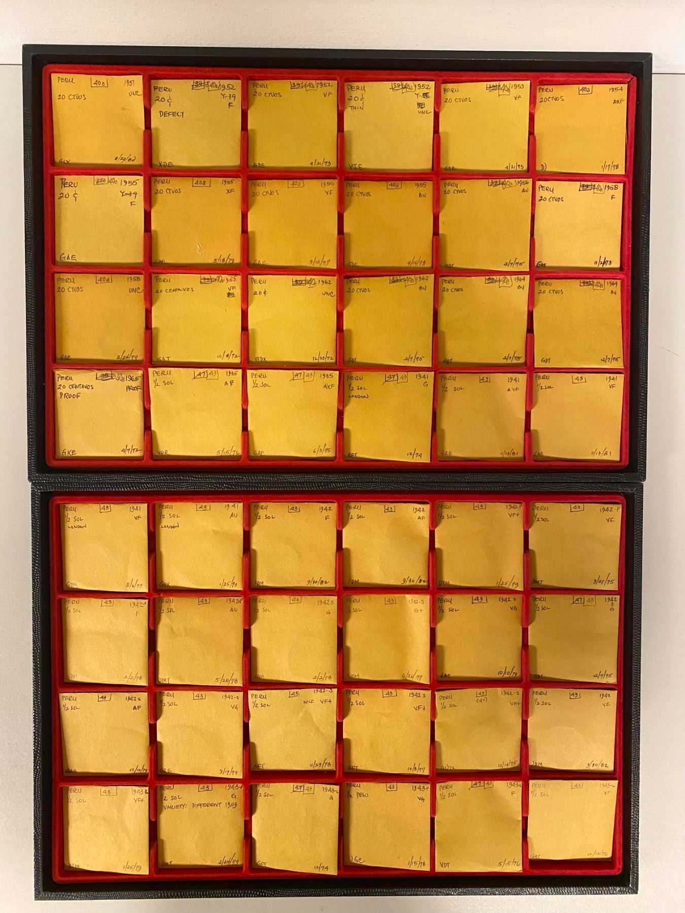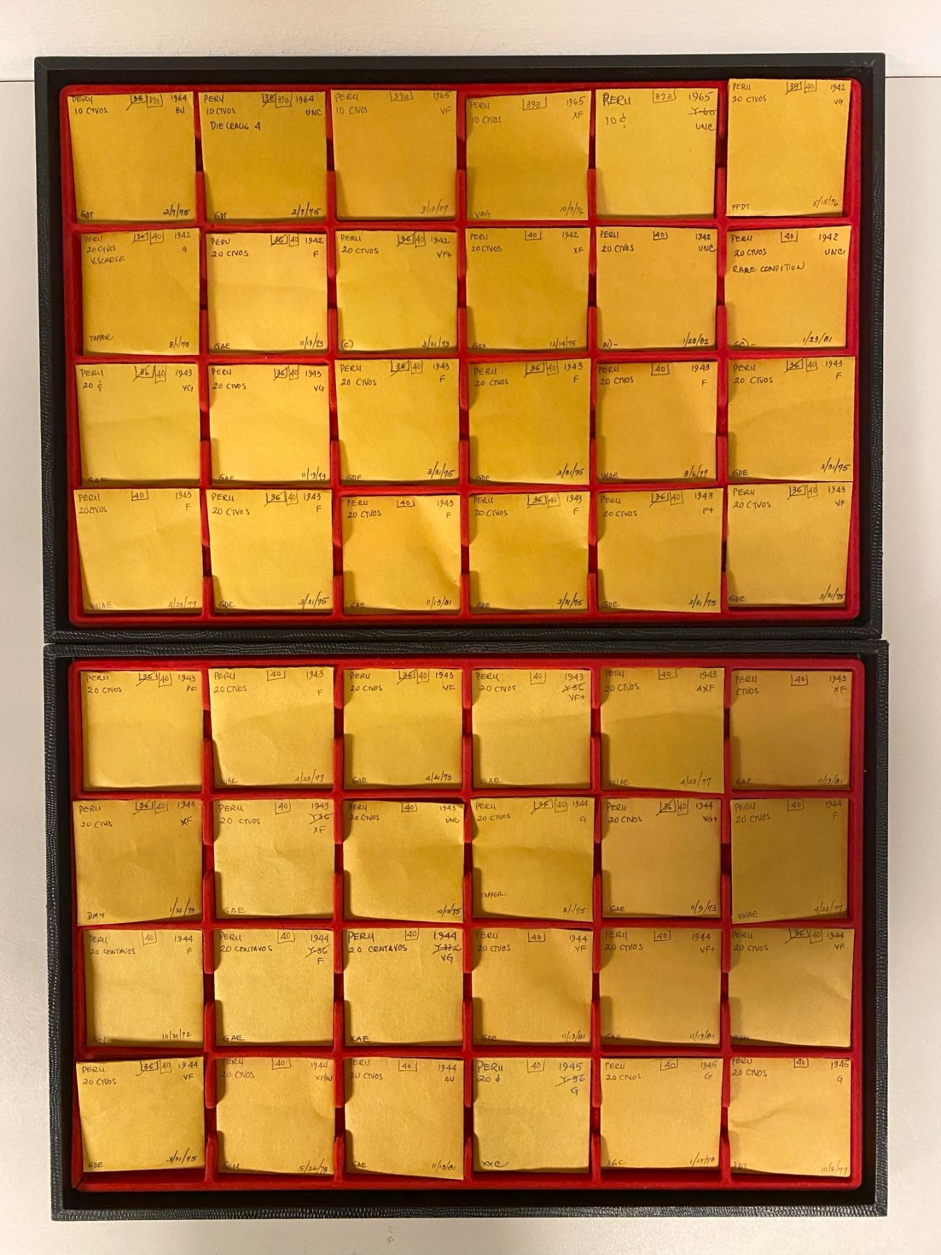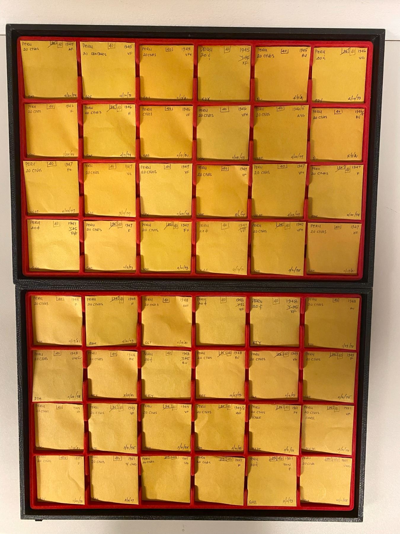 PERU: LOT of 236 coins, all worked up in paper 2x2 holders by Dan Ching of base metal 20th century coinage including; 1 centavo (6), 2 centavos (2), 10 centavos (45), 20 centavos (67), ½ sol (91), 1 sol (25), a great variety of dates including some scarce years, average circulated condition, retail value $500, lot of 236 coins, XF, ex Daniel K. Ching Collection.
