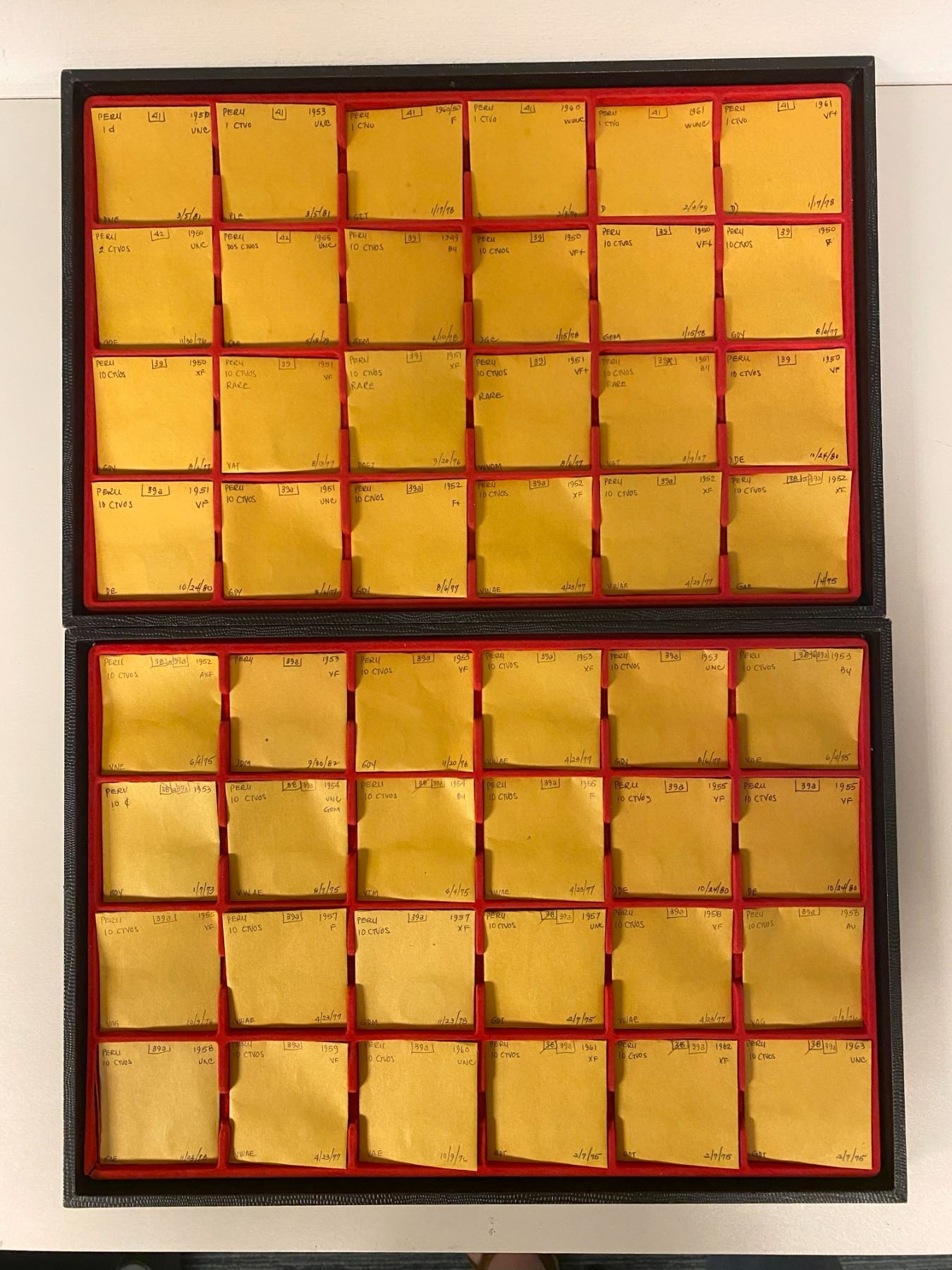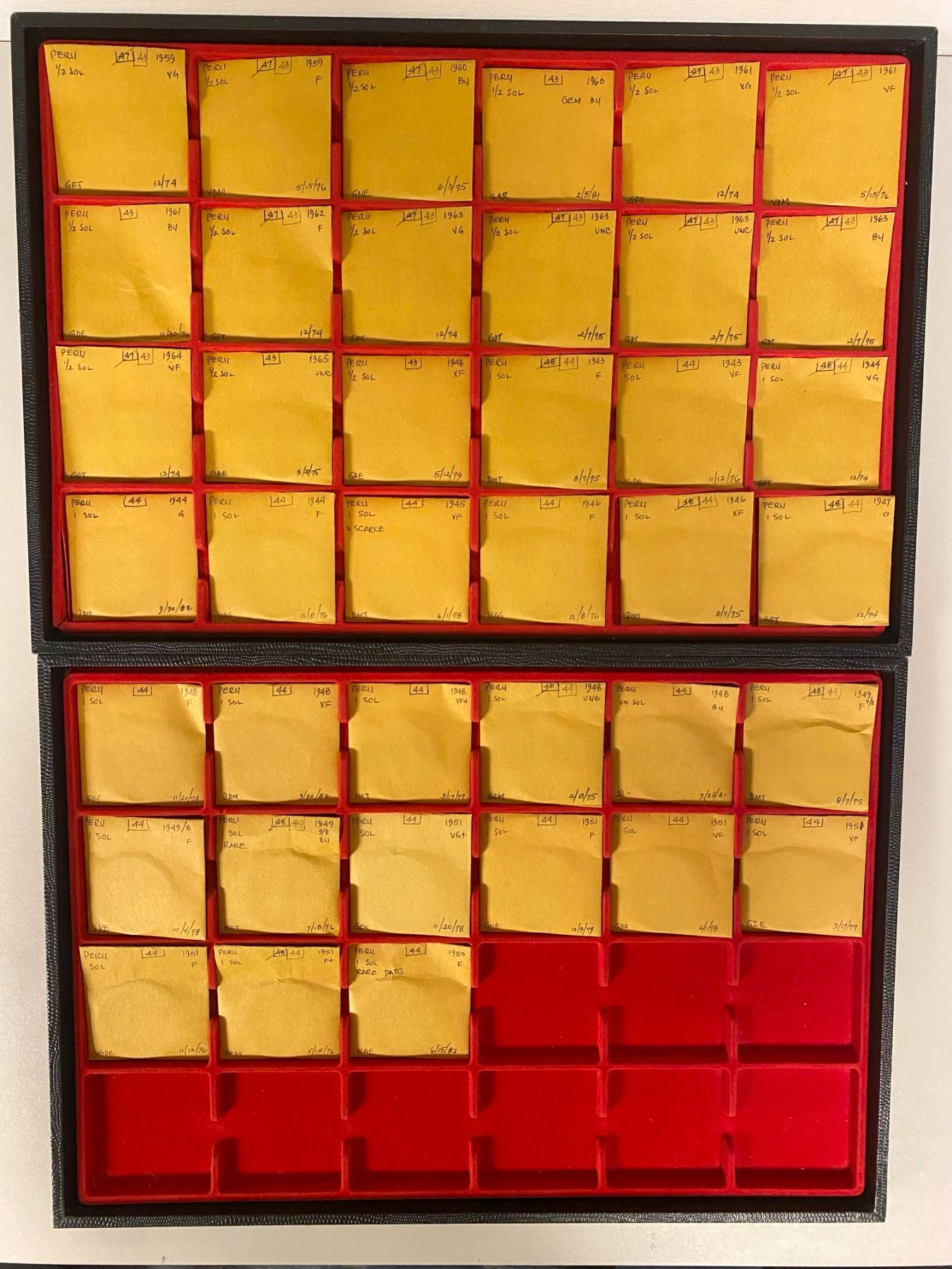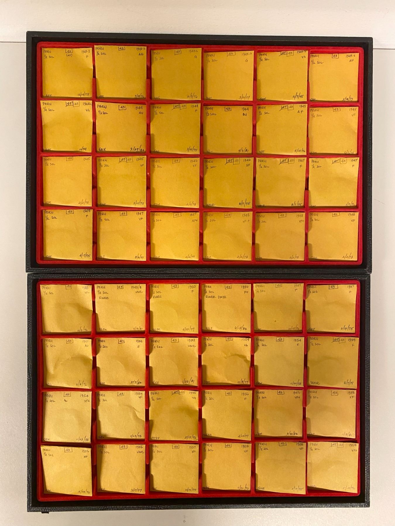 PERU: LOT of 236 coins, all worked up in paper 2x2 holders by Dan Ching of base metal 20th century coinage including; 1 centavo (6), 2 centavos (2), 10 centavos (45), 20 centavos (67), ½ sol (91), 1 sol (25), a great variety of dates including some scarce years, average circulated condition, retail value $500, lot of 236 coins, XF, ex Daniel K. Ching Collection.