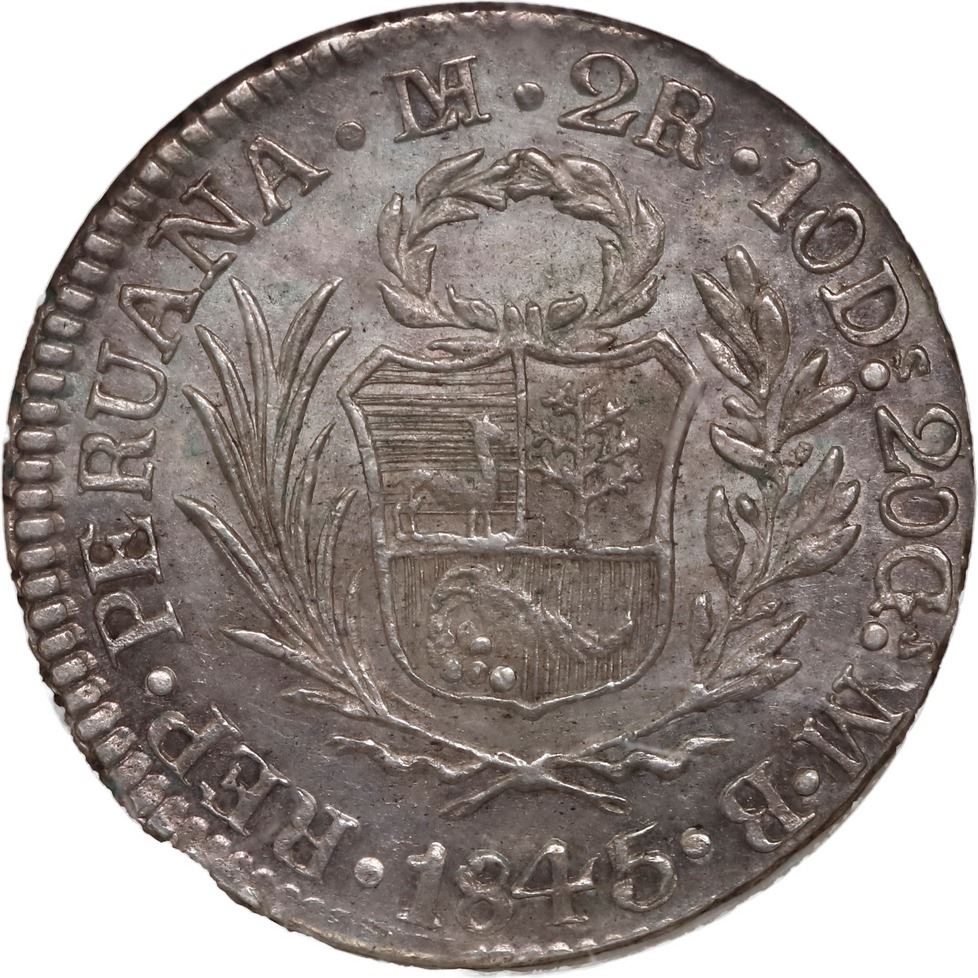 PERU, Lima, 2 reales, 1845 MB, NGC MS 61, finest and only example in NGC census, ex-Whittier, ex-O'B