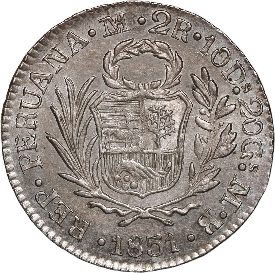 PERU, Lima, 2 reales, 1851 MB, NGC UNC details / obv cleaned, ex-O'Brien.