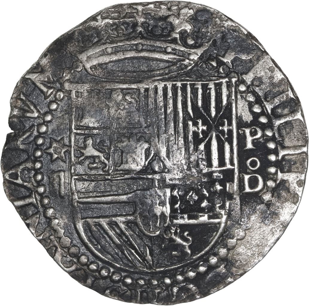 PERU, Lima, cob 2 reales, Philip II, assayer Diego de la Torre, *-ii to left, P-oD to right. S-L4; KM-9; Cal-338. 6.44 grams. Detailed XF with full cross and shield, the latter with only very minor doubling, patchy dark surface encrustation across the fields, edges a bit crude yet with most of the legends visible.