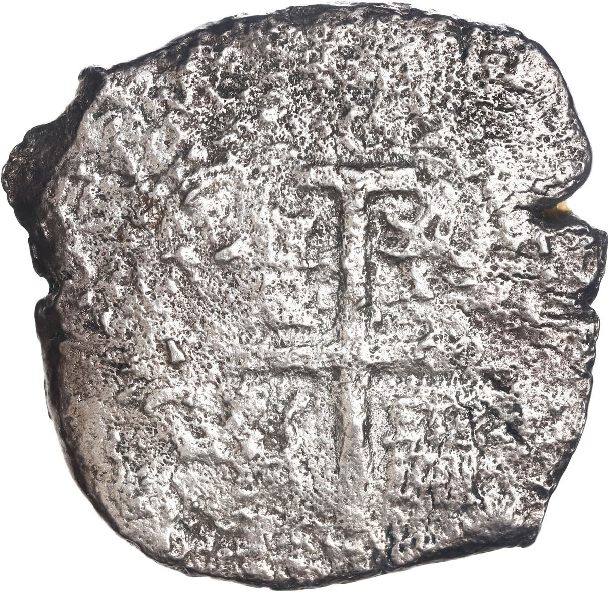 PERU, Lima, cob 8 reales, 170(?) H. 21.60 grams. Silvery, corroded surfaces with some pillars and cross detail still visible, scarce type from the 1715 Fleet. Pedigreed to Sedwick Auction 13, with original lot-tag 719 and photo-certificate from 2002. Recovered from: Spanish 1715 Fleet, sunk off the east coast of Florida