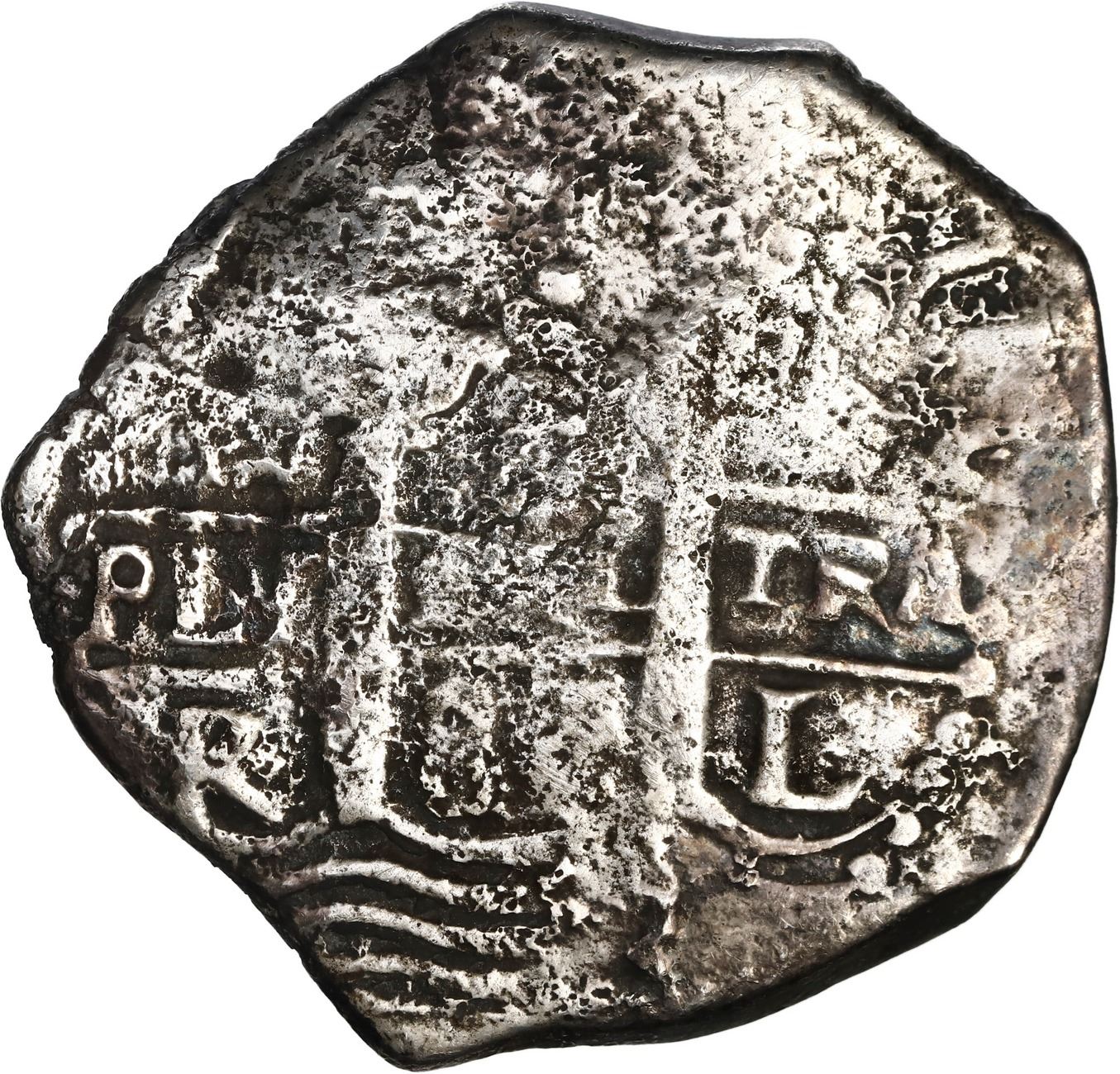 PERU, Lima, cob 8 reales, Charles II, 1686(?) R. S-L7; KM-24; Cal-Type 104. 23.59 grams. Corroded yet solid piece, probably dated 1686 but with the final digit between pillars not certain though with clear assayer R, decent cross side detail, desirable type from this wreck. Recovered from: Association, sunk in 1707 off the Isles of Scilly, south west of England