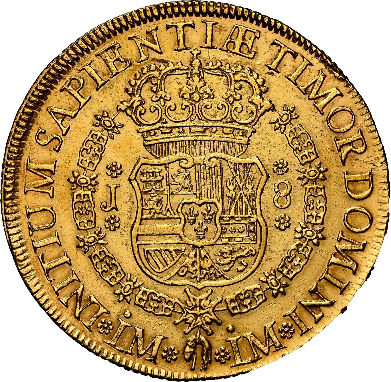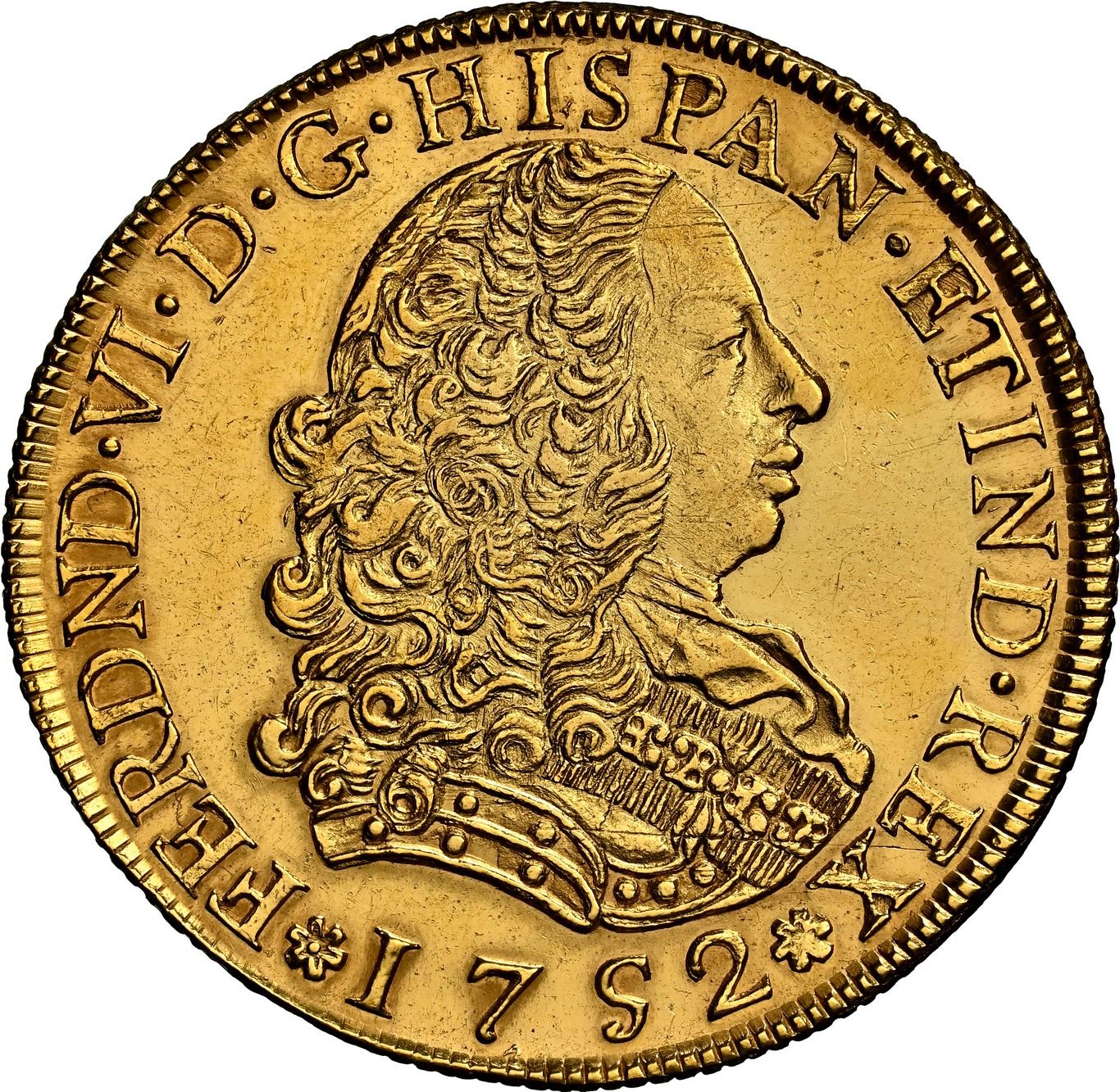PERU, Lima, gold bust 8 escudos, Ferdinand VI, 1752 J, first bust, NGC UNC details / cleaned, ex-Almenara. Cal-765; Fr-16; KM-50. Super-sharp full details with brilliant luster throughout, hairlined on fields from cleaning, still quite impressive in quality. Pedigreed to the Almenara Collection (stated on label).
