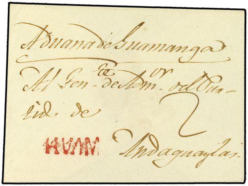 (1845 CA.) Sobre dirigido a ANDAGUAYLAS. Marca HUAM en rojo, manuscrito "Aduana de Guamanga". MUY RARA.