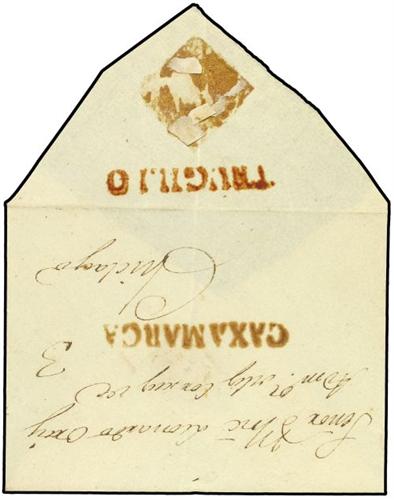 (1845 CA.) Sobre dirigido a CHICLAYO. Marcas CAXAMARCA y TRUGILIO ambas en rojo. MAGNIFICA.