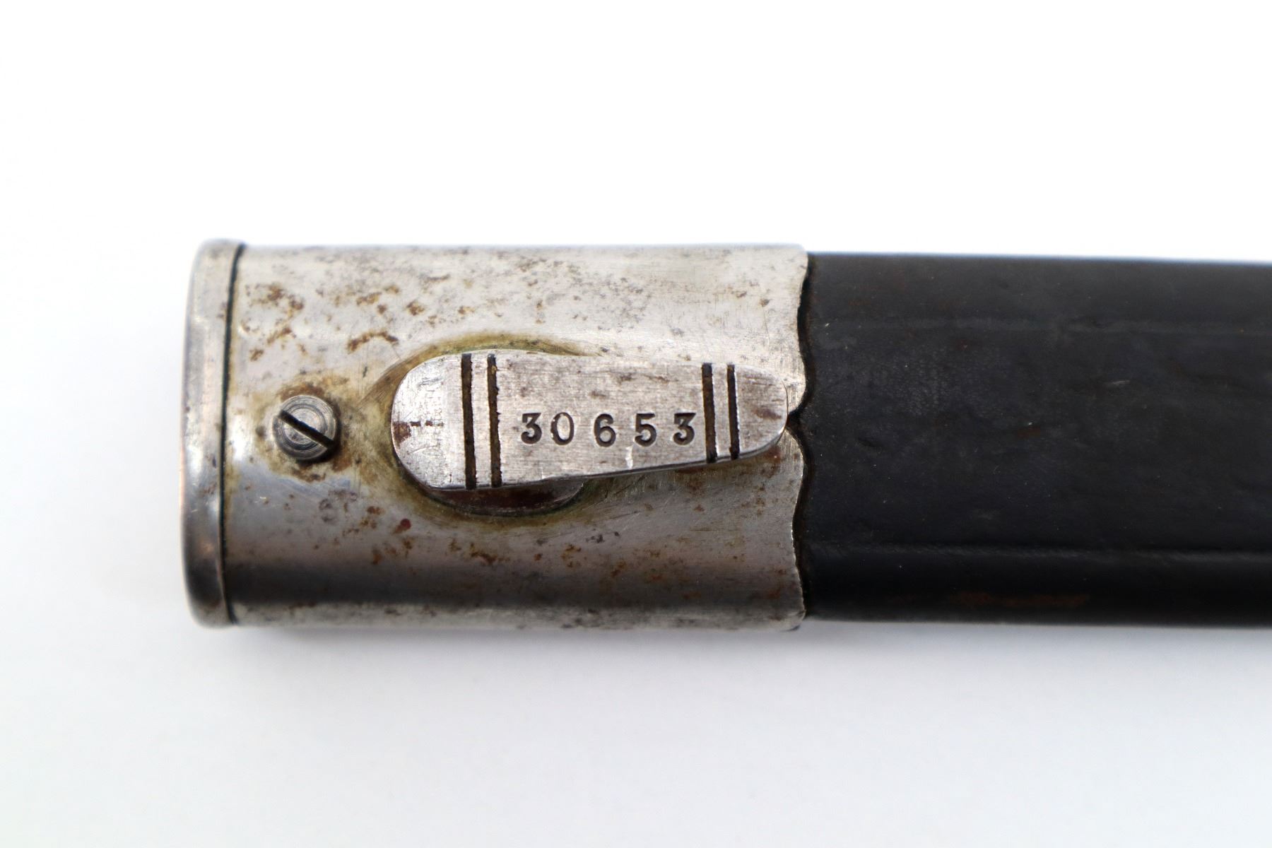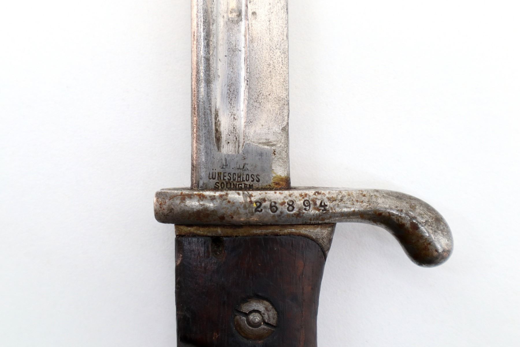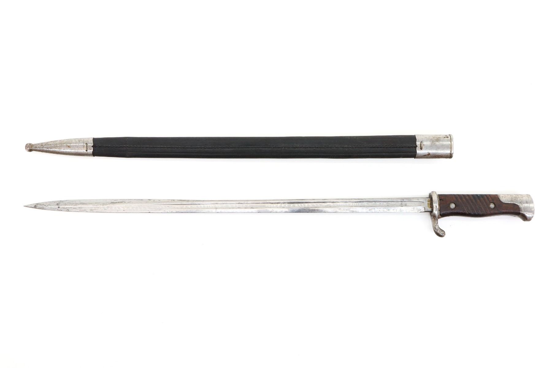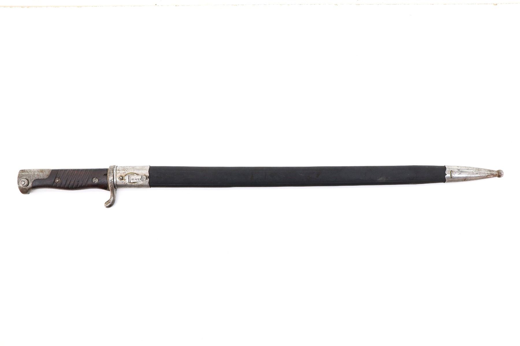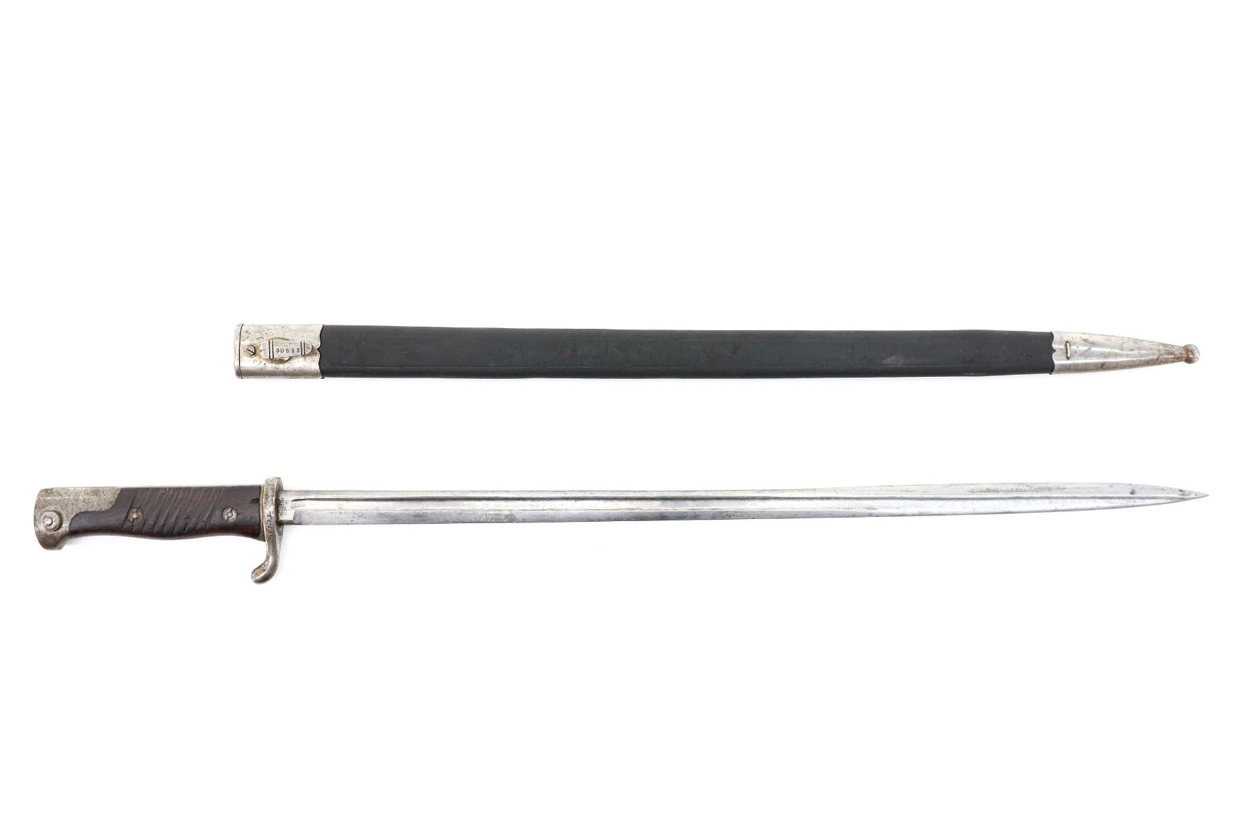 (1) FITS 7.65MM MAUSER FUSIL PERUANO MODELO 1909 (PERUVIAN MODEL 1909 RIFLE), RICASSO MARKED: "?.?." OVER "LUNESCHLOSS, SOLINGEN", CROSS-PIECE MARKED: "26894", WITH QUILLON, GROOVED 2-PIECE WOOD GRIP, NO VISIBLE MARKINGS, METAL POMMEL WITH PERU NATIONAL CREST PROOF MARK, LEATHER & METAL SCABBARD, STUD MARKED: "30653", BLADE APPROX. 20.75" & OAL APPROX 26". SEE PHOTOS.