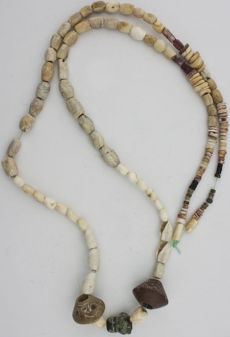 Peruvian Moche civilization necklace, 24" long overall, composed of various cowrie shells and other beads including two larger beads bearing an intricate design and a small bust of a war god's head. Restrung, with a Peruvian gallery COA. Very good.