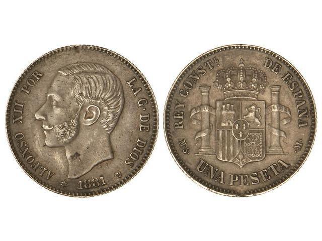 PESETA SYSTEM: ALFONSO XII - 1 Peseta. 1881 (*18-81). M.S.-M. Pátina. (Pequeño defecto de acuñación en gráfila). RARA. EBC-.