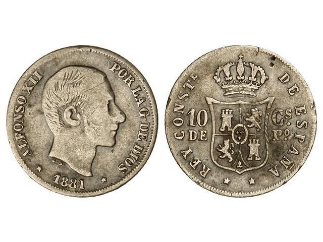 PESETA SYSTEM: ALFONSO XII - 10 Centavos de Peso. 1881. MANILA. MBC-.