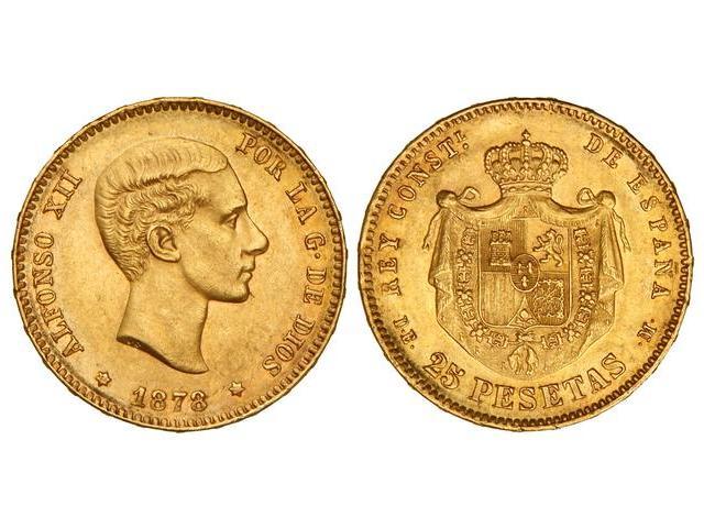 PESETA SYSTEM: ALFONSO XII - 25 Pesetas. 1878 (*18-__). D.E.-M. (Pequeñas rayitas en anverso). EBC-.